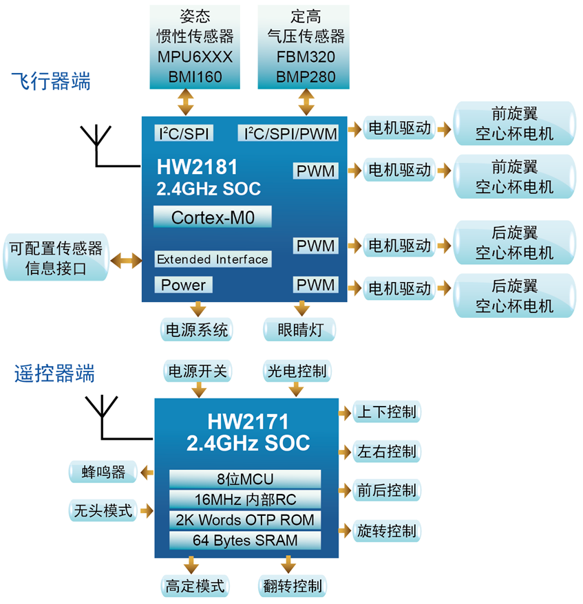 | 2 颗SOC芯片方案 | 飞行器端HW2181,遥控器端HW2171 |
